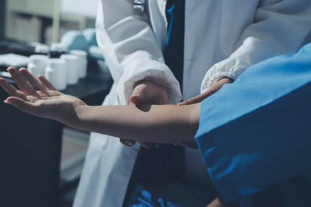 Doctor catch the pulse with patient in nursing hospital ward, healthy strong medical concept.