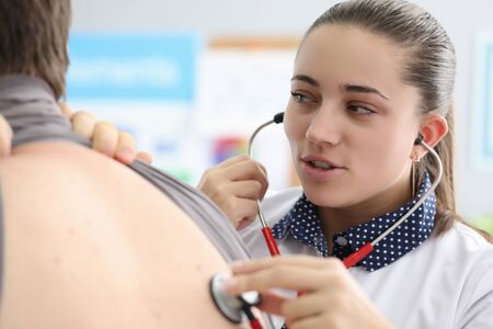 Close-up of beautiful female physician examining lugs and respiration of patient with stethoscope. Scheduled check-up. Modern medicine and healthcare concept