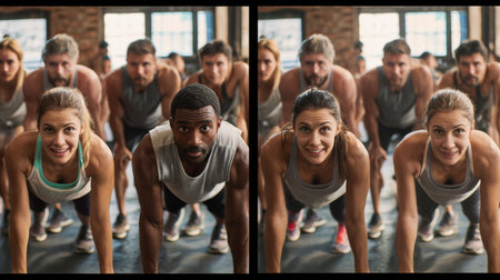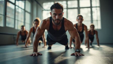 A focused man leads a group of determined individuals in a push-up exercise, showcasing strength and teamwork in a sunlit gym. The atmosphere is charged with energy and motivation, highlighting the commitment to fitness and camaraderie among the participants.