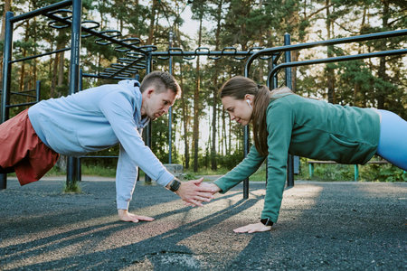 Young adult man and woman exercising outdoors, performing plank position while reaching out and touching hands, fitness training at outdoor gym