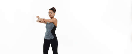 Sport, training, lifestyle and Fitness concept - Full-length portrait of beautiful happy African American woman stretching hands. Isolated on white studio background.