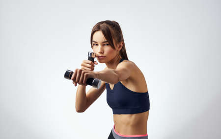 energetic sportswoman is engaged in active exercises on a light background and dumbbells towel fitness
