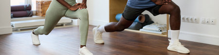 Horizontal high angle view shot of young Black man and his Caucasian girlfriend doing morning workout at home and watching something on smartphones