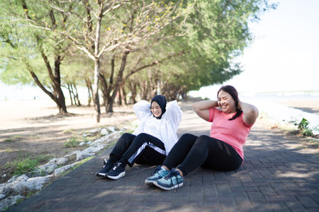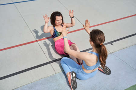 Best friends clapping at the hands while pumping abdominal muscles on the stadium