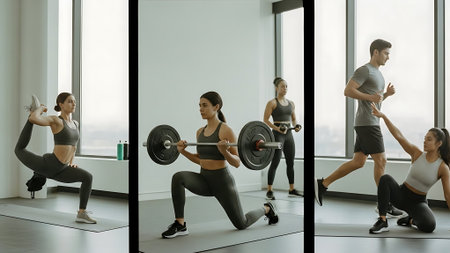 Two people performing lunges in a modern fitness studio, showing strength and flexibility. Yoga mats and fitness equipment visible in background