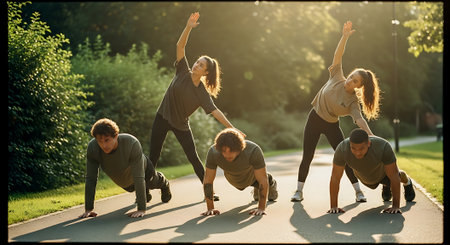 Five individuals performing push-ups on a road surrounded by greenery and trees during what appears to be either sunrise or sunset.