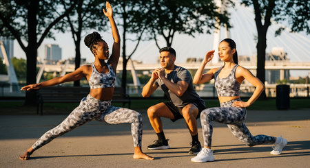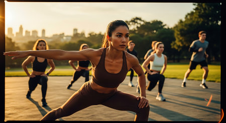A diverse group exercises outdoors at sunset, focusing on lunges and dynamic movements in a park setting.