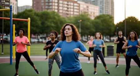 Diverse group performing calisthenics in a sunny urban park with tall buildings in the background.