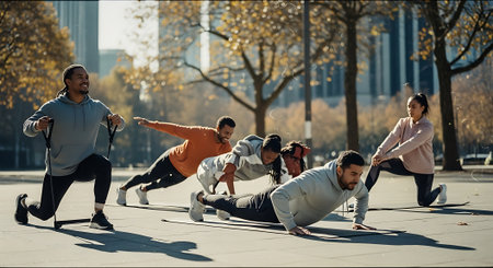 A diverse group performing various exercises in an urban park setting, wearing athletic clothing and sneakers.