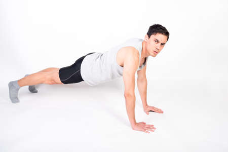 Doing pushup Full length of young handsome man in sportswear doing pushup at gym : Generative AI