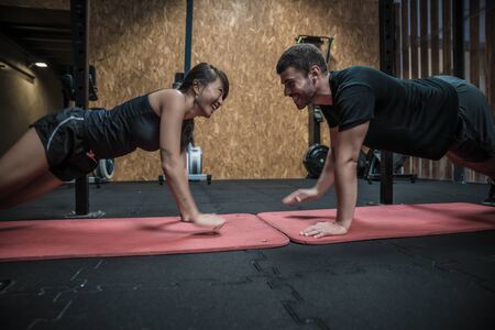 Sport men and women exercise planking on yoga mat in sport gym together six pack building