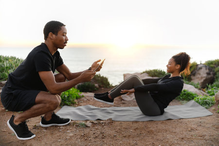 Glad young african american female and male in sportswear do abdominal exercises on beach