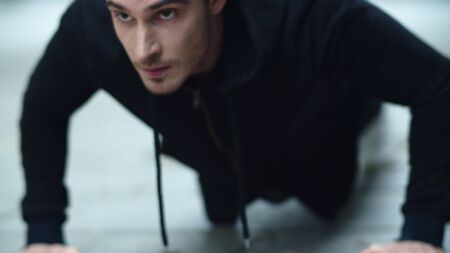 Closeup fit man pushing up outdoor in slow motion. Close up sport man doing push up exercise on street workout. Male athlete training strength at city street.