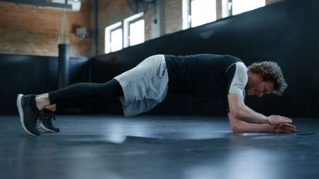 Tired sportsman doing push ups at gym. Young fighter making exercises in sport club. Progressive kickboxer preparing for fight in fitness center.