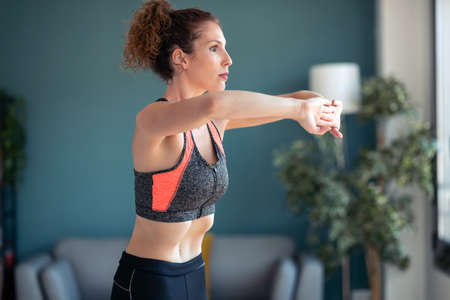 Shot of attractive sporty young woman doing hypopressive exercises in living room at home.