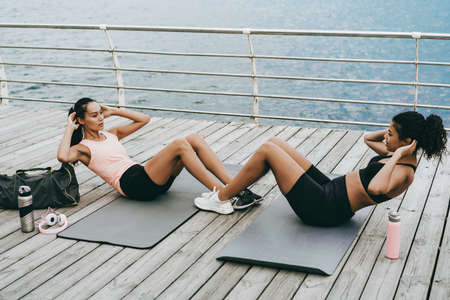 Young sporty fit women exercising abdominal muscles doing twisting exercise lying on mat outdoors