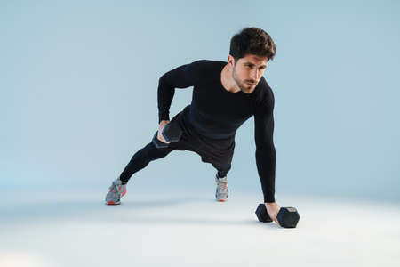 Handsome athletic sportsman working out with dumbbells isolated over blue background