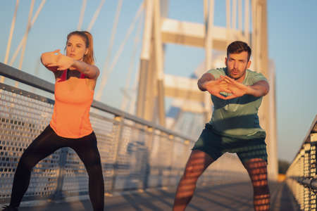 Side view of young couple doing warm up exercise outdoors on terrace, sport and healthy lifestyle concept.