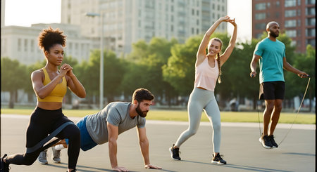 Diverse group performing various exercises outdoors, wearing casual athletic clothing and listening to music.