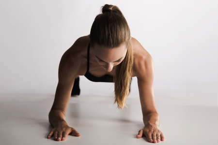 Sport. Young fit woman doing plank. Sporty and strong girl exercising. Fitness exercising. Side view. High quality photo