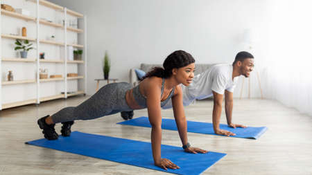 Millennial black couple standing in plank position on yoga mats at home, panorama