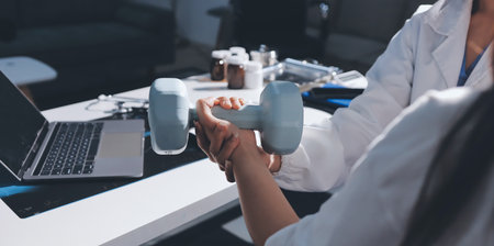 Close up doctor physiotherapist and nurse helping happy patient lift dumbbell with one hand. Healthcare industry