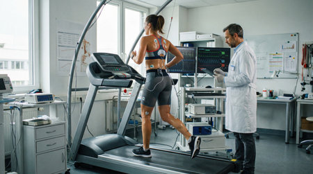 athlete runs on a treadmill in a lab while medical staff observes and records data. Equipment measures performance metrics as the test progresses. The setting is bright and professional.