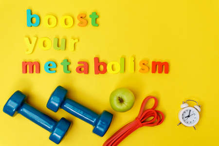 Boost your metabolism sports dumbbells, apple, alarm clock top view.