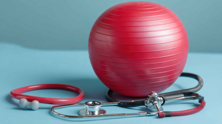 A vibrant red exercise ball and stethoscope on a blue surface symbolize the connection between fitness and health. Ideal for wellness-related themes.