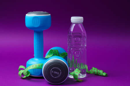 Healthy lifestyle still life. Dumbbells, ruler, bottle of water on purple background. Slimming concept