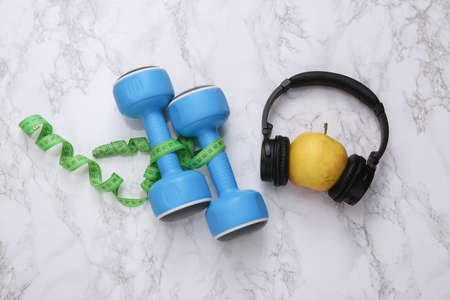 Weight loss, diet, fitness concept. Dumbbells wrapped with measuring tape and headphones with apple on a marble surface