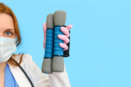 Doctor in a white uniform with dumbbells in hand on a blue background, copy space.