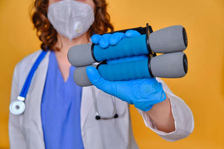 Doctor in a white uniform with dumbbells in hand on a yellow background, copy space.