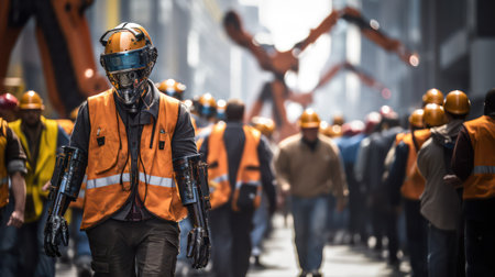 A group of bluecollar workers, wearing hard hats and workwear, are standing in a line on a city street. Some have beards and others are engineers, all wearing personal protective equipment
