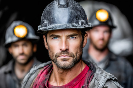 Tough miners with dirty faces and clothes standing together, representing hard labor