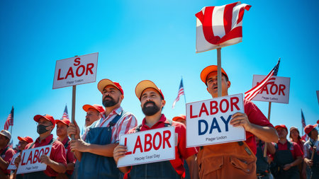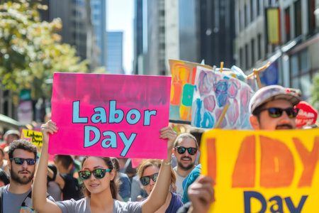 Crowd marching on Labor Day holding colorful banners celebrating workers' rights and achievements
