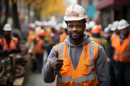 Portrait of african american worker showing thumbs up on construction site