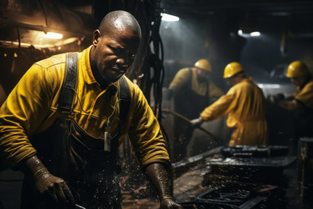 Experienced mature african descent male construction worker wearing protective gear and displaying a focused and serious facial expression while working at the construction site