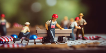 Miniature figures of workers against yellow backdrop