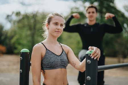 Gorgeous young woman and her workout partner getting stronger arms while working out with resistance bands