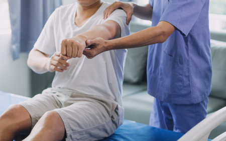 Asian nurse therapists stretching arm muscles treatment of physiological.
