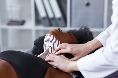 Kinesiology taping. Physiotherapist applying kinesiology tape to patient neck. Therapist treating young female African American athlete. Post traumatic rehabilitation, sport physical therapy.