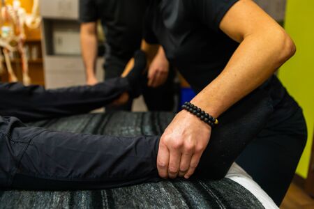 A professional physiotherapist is stretching the patient's legs, the patient has muscle dysfunction due to hard work, most often an office worker who has problems sitting for long periods of time.