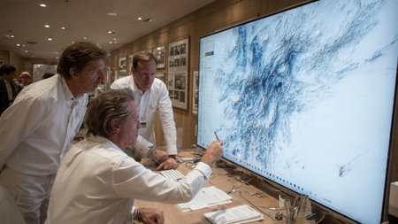 A group of scientists collaborates in a modern laboratory, exploring vibrant digital displays filled with complex data patterns. They engage in research and analysis.