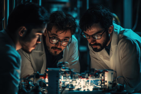 Three researchers in lab coats examine a sophisticated electronic device in a dark laboratory, illuminated by the glowing circuitry as they discuss their findings and ideas.