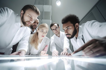 Collaborative innovation: Lab professionals discuss AI research with digital overlays.
