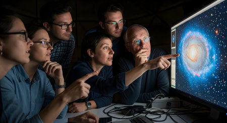 A diverse team of astronomers gathers in a dark observatory, intently focused on a large computer screen displaying a vibrant spiral galaxy. They are pointing and discussing their findings, capturing a moment of scientific collaboration and discovery.