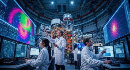Group of researchers in protective suits study swirling plasma in a high-tech lab filled with equipment.