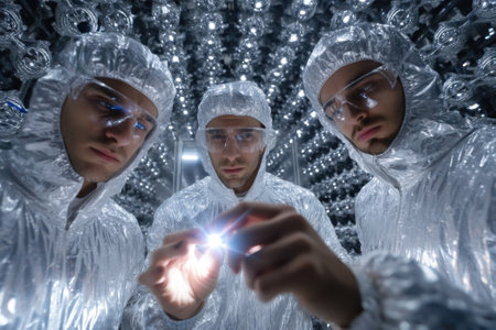 Three scientists in silver suits investigate a light source inside a high-tech laboratory environment.