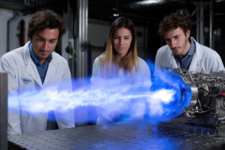 Three students in lab coats watch an experimental jet engine produce a blue exhaust flame in a lab.